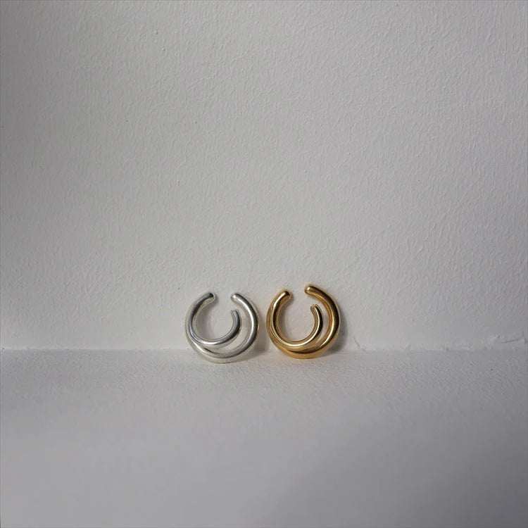 猶如兩個圓形交錯而成的曲線,由於兩個圈形的大小不同,佩戴的方向不同所帶來的視覺效果也會有所變化。一只就可以帶來豐富的層次與亮眼的設計感。不僅可以單獨配戴,混搭其他耳環的效果也非常令人驚艷。